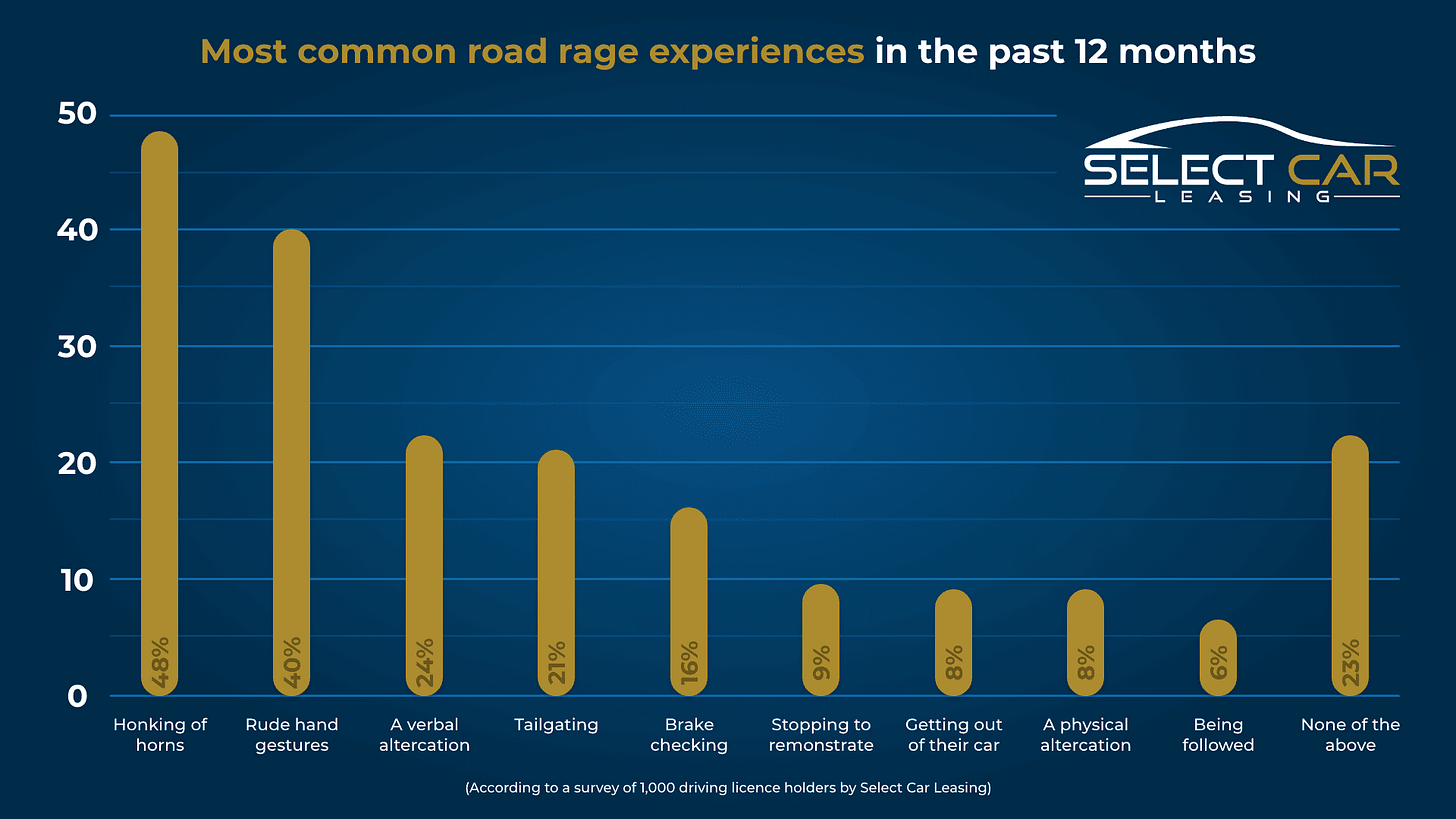 The research from UK leasing company Select Car Leasing also shows 77% of drivers have experienced some form of road rage, with nearly one in 10 experiencing another driver stopping to argue with them, while many say they were involved in a ‘physical altercation’; 6% say they were followed after upsetting another motorist.